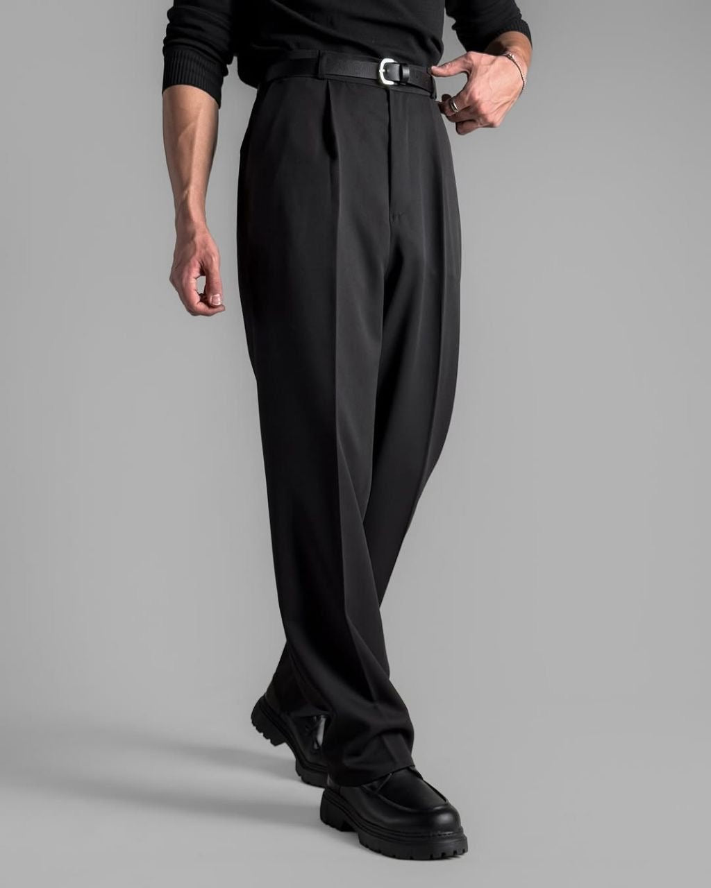 BLACK STRAIGHT FIT SINGLE PLEATED TROUSERS